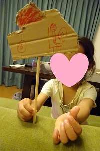 昨日、段ボールで工作をしてた娘(幼稚園年中)は、寝る直前になってまた一つ作品を作った。もう寝るよ!って言ってるところで作り始めて、ササっと出来上がった。早すぎてびっくり!棒は割り箸を使った。棒の部分はソファの向こうに隠して、人形劇のようにして話を作ってた。「むかーしむかし、あるところに、救急車がいました」って始まってたけど、寝る準備してて、その先聞いてない(^^;