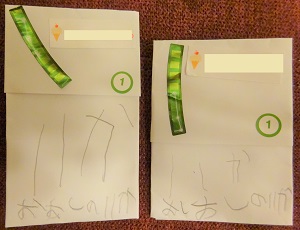 この前、友だちに手紙と折り紙で作ったまぐろのお寿司をあげたんだけど、https://plaza.rakuten.co.jp/imoimoco/diary/201906140001/昨日だっけな?2人の友だちにもお寿司をあげる。って言って、いかのお寿司を2個作ってた。今日はそれと一緒に渡す手紙を2人同じように書いてた。一人は色鉛筆だから、写真では見づらい。。。最後に貞子の絵も描いてた(^^;
