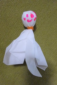 「運動会で飴が降らないように、てるてる坊主作らないと!」今週半ばくらいに娘(幼稚園年長)が言った。金曜日に作ろうとしてたけど、今日は確実に雨だったから、他のことして過ごそうかと思ったら、娘が眠くなって早く寝ちゃったから、作らずに済んだ。明日の天気はビミョーだから、作ると良いかな?と思って、「今日は絶対作ろう!」って思ってたら、娘の方から言ってきた。ってことで、てるてる坊主。顔を何度も失敗して、外側だけ作り直すこと数回。ヘアバンドも付けてるらしい。