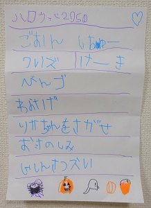 今日は家でハロウィンパーティーをやる日。今までにないピンチだったけど、どうにかなった。ハロウィンカードはとりあえず置いといて、病院帰りに息子(小学校6年生)と娘と一緒にケーキを購入。コージーコーナーでかぼちゃのモンブランと、かぼちゃが嫌いな娘にはチョコシフォンを買った。昼過ぎから娘(幼稚園年長)と準備をした。娘はプログラムを書いた。娘は自分で鏡文字になっちゃうのを知ってて、初めは書きたがらなかったけど、息子も小さい頃から上手じゃないけど書いてたと話したら、空いた場所にハロウィンの絵も描いてくれた。私は隣でビンゴカードを作ってた。ハロウィンカードも間に合った!私がカード作ってる間、娘がハロウィンのお菓子を並べたり、輪投げやビンゴの準備をしてくれてた。夕食は息子の要望でかぼちゃシチュー。でも娘はかぼちゃが嫌いだから、半分白いシチューで半分かぼちゃシチューを作った。娘は人参の皮をむいてくれた♪