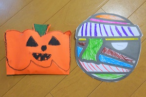 今日は幼稚園でハロウィンをした。今回はコロナだから、顔のペイントは無し。まず1つは、包帯おばけに色を塗ること。園長先生と副園長先生が部屋に来たら、担任の先生と一緒にお菓子を配るから、子どもは先生の前に行って「トリックオアトリート」って言って、手作りのかぼちゃバッグ(事前に作ったもの)に入れてもらい、最後にホチキスを止めてもらった。ハロウィン土産はこの2つ。かぼちゃバッグの中身は3つ。