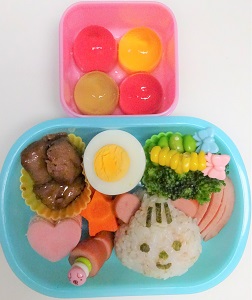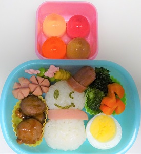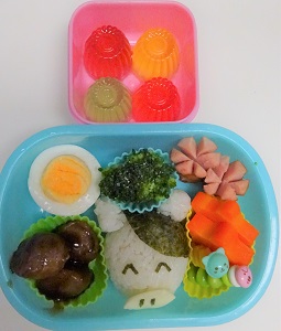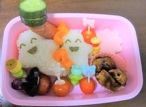 娘(幼稚園年長)が自分のお弁当を作りたがってた。次、幼稚園が休みの日に作る約束をしてて、今日は市内の私立幼稚園が休みの日だから、今日お弁当作りをした。12時半からダンスがあるから、11時過ぎに食べるとして、お弁当作りは10時にスタート!材料はどこまで使うか分からないっていうから、適当に準備。娘のテーマは「森のおばけ」今日は12時半からダンスだから、11時過ぎには出来上がって食べ始めたかったんだけど、完成したのは11時半過ぎだった。「食べられなかったら後で食べようね」って言ったけど、おばけ1匹残してお腹いっぱいになったから、出かける前に昼食を終わらせることができた。おばけは白いご飯で作ったんだけど、上手く作れずに断念。ウインナーにチーズを巻いて花にする予定が上手く出来なくて残念そうだったけど、ハムとチーズのミルフィーユで花を作った。左上のウインナーを立ててキュウリを載せたのは木。右下には焼き鳥。おばけの所に音符の人参。あとはミニトマト、枝豆、コーンをピックに刺して置ける場所に置いた。このピック、動物もリボンもミッキーの手も、全部おばけって設定だ。明るくて可愛いお弁当ができた!ゆで卵を入れる場所が無くなっちゃったから、別皿に入れた。で、私はお花弁当。あまり物のおかずをあちこちに置いた。キュウリは飾り切りして葉っぱにしたかったけど、思ったより娘の手伝いが増えて、そこは諦めた。お弁当作り、楽しめたみたいで良かった♪
