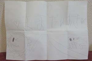 今日、娘(幼稚園年長)が、私に絵を描いて持ってきた。上に「ままだいすき」って書いてあって、下にスマイリーとなろくんを描いてた。最近お気に入りで、寝る前に私と息子(小学校6年生)と娘で見るのが定番になってる。(スマイリー&なろくん)https://www.youtube.com/channel/UCoAAHGFRFY_0WfXOJZybUXAそれから今度は息子に書いてた。こういうの受け取らないって知ってるから、あげようとは思ってなかったみたいだけど。左に「はるまバカ」「はるまバカ」「はるまあほ」「はるまあほ」顔「はるまあほ」って書いてある。で、真ん中の上(2行目)に「すきだよ♡」って書いてあって、帽子をかぶった息子の絵が描いてあった。いつも怒ってるけど、大好きなんだね(笑)
