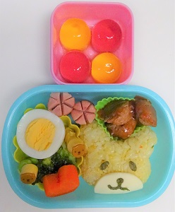 今日のお弁当は、何回聞いても決まらなくて、ラップにご飯を包んだ状態で、「決まらないなら”うさちゃん大好き弁当”にしちゃうよ」って言った。すると娘は「カレー...カレー」って言う。「じゃあ、カレーでくまちゃんにする?」って聞いたら、「そうする!」って言った。ちなみに、カレーふりかけは、永谷園「彩ごはん」を使ってて、その中のカレー色のものだけ選んで混ぜてる。くまはカレーふりかけを混ぜ込んで色付け、チーズとのりで装飾熊の上にはミートボール左下にはブロッコリー、枝豆、コーン、ハート人参、ゆで卵上の隙間に飾り切りウインナーデザートはフルーツゼリー楽天レシピで“お弁当”検索しよう抗菌シート お弁当用 6×10cm 40枚入ミッキーマウス ウインナーカッター LWC1(SKATER/スケーター) (弁当箱 水筒 まんまる堂)海苔パンチ にこにこパンチ パート3【ゆうメール対応】ラクラクママ おかしなピックス 8本入り かわいい動物がスイーツに変身!【子育て】【幼稚園】【お弁当】