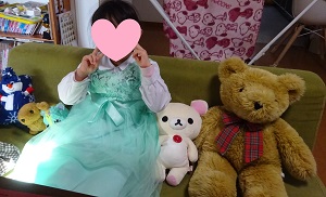 今朝、幼稚園に行くから、娘(幼稚園年長)に声をかけたら、ドレスを着てソファに人形たちと一緒に並んでた。「何してるの?」「くまちゃんパーティーに呼ばれたの」右の2匹のくまのパーティーに誘われた、娘、ウーモ、犬、スノーマンが並んでた。