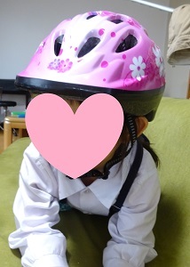 娘(幼稚園年長)の自転車のヘルメットは、初めて買ったヘルメット。去年の4月、誕生日に自転車を買ったついでに新しいヘルメットを買おうとしたんだけど、気に入ったデザインが無くて買うのをやめた。でも、最近流石に小さくなったから、楽天市場でもう一度ヘルメットを見せてみた。で、今回はピンクの花のヘルメットに決めて注文した。今日、幼稚園に行ってる間にヘルメットが届いた。家に帰って来て箱を見た娘は、幼稚園の片づけもせずに開けてた。紐の長さを調整したら、かぶって嬉しそう!そのままソファでYouTubeを付けておやつを食べ始めた。帰ってきた息子がその姿を見て笑ってた。次に、ヘルメットをかぶりながら床で英語の宿題。何故床なのか分からないんだけど...娘は可愛いヘルメットを付けたから服も可愛くしたいと思ったみたいで、クリスマスプレゼントでもらったドレスを着た。ファッション的にどうかと思うけど、本人大満足(笑)