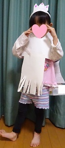 昨日、娘(幼稚園年長)が一生懸命、裏紙を切って合わせて服を作ってた。見えない場所で内緒で作って、私に着せてもらおうと思って来たんだけど、片方肩ひもがあるのに片方ない...上手くいかないことに気づいて嫌になったようだけど、「ここの紐長くすれば良いだけだよ」って言ったら元気になった。頭の飾りは、王冠ヴージョンと、可愛い毛糸が垂れてるティアラヴァージョンがある。そして、今日も気づいたら服を作ってた。