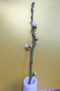 娘(幼稚園年長)が「白がある!」って言うから見ると、幼稚園から貰って来た梅の枝の花が咲きかけてた!写真を撮ったんだけど、背景が七五三の写真でほぼ花見えず...後ろに何か置こう!って私が行ったら、娘が裏紙を出したんだけど、後ろに白い裏紙はちょっと...自分の机を見ると、工作の画用紙がある!!!何色にしようかと全体を見て、金にしてみた。娘に「お正月みたいだね」って言われた(^^;