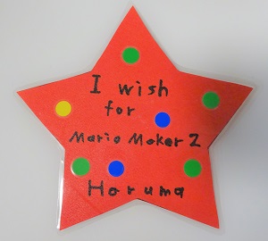 今日、息子(小学校6年生)が英語に行こうとバッグを見たら、先週持って帰ってきた英語のツリーに飾ったものが出て来た。みんながクリスマスの願い事を書いてツリーに飾ってたもの。SNSに載ってて、内容を見て、上の方にあったのが絶対息子のだと思ったから、息子に確認したら、やっぱりそうだった。★I wish for Mario Maker2★