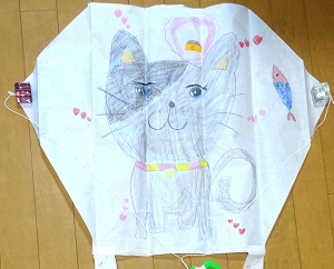 今日、娘(小学校2年生)は生活の授業で凧揚げをした。事前に作ってた手作りの凧を持って学校の近くの広い公園に行ったらしい。学校の授業でそこの公園に行くときは、大抵虫を獲るのが目的だから、虫嫌いの娘は、行くのを嫌がってた。でも、実際行ってみると楽しかったみたいで、帰ってきてすぐに凧を広げて見せてくれた。猫の絵の力作!下の2本の紐には猫の好物の魚をたくさん描こうとしたけど、終了時間が近づいてきたから、左右同じくらい描けるよう、紐全体に描くのは諦めて、上から半分くらいに変更したとか。凧揚げは、2人1組でやったらしい。普段聞かない名前の子が相棒だったから、どうやって相手を決めたのか聞いたら「背の順」って言われて納得。凧の持ち主が凧の紐を持って、相棒がたこを持って、「せーの」で持ち主が走って相棒が手を離すというやり方だったよう。凧は上手く上がったようで、娘は大満足な雰囲気だった。