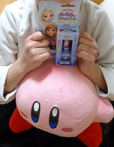 今日は、お年玉で娘(小学校2年生)の買い物に行ってきた。年末にどんなものがあるのか下見してきたから、ある程度決めてるみたい。今日に決めた理由は、バスケが休みだったのと、パパと息子(中学校2年生)が出かけて夕飯を食べてくる予定で、家で夕飯を食べるのは私と娘だけだから、遅くなったら適当に作るか食べてくるかすればいい。と思ったから。でも、骨折してる息子が行っても暇になるからと、パパ一人で出かけることになった。ってことで、息子の夕飯も必要だからと、早めの昼食を食べてから、必要な買い物だけして帰ってくるという条件ででかけた。ちょうど、昼食前に友だちからフォートナイトに誘われたから、娘も買い物だけして帰ろうという気になってくれたのは良かった。前もって一通り見ておいたおかげで、欲しいものは固まってたらしく、娘は店でメイク道具コーナーとカービィグッズ売り場しか見てない。3000円+予備で持っていったお小遣いで買えるか確認しながら選んだ。初めはアイシャドウ+ネイル+余ったお金で買える値段のぬいぐるみにしようと思ってたけど、2番めに大きいカービィが欲しかったから、アイシャドウはやめた。ネイルは、透明系ではなくしっかり色が付くものが良いからと、ディズニーの色が変わるマニキュアを購入。お試し出来ないけど、色が変わるくらいだから、分かりやすい色をしてるんじゃない?って思ったし、家にあるマニキュアと同じものが色々あったから、娘が色の濃さを見くらべて確信してた。ということで、今年のお年玉は、カービィぬいぐるみ(M)とマニキュア(ブルー↔ライトブルー)になった。あと貯金。星のカービィ カービィ ぬいぐるみ M スタンダード インテリア マスコット/パーフェクト・ワールド・トーキョー(Perfect World Tokyo)ネコポス可 アナと雪の女王 はがせるマニキュア DN43077 マジカルネイル02 粧美堂 ディズニープリンセス キッズ コスメ あす楽