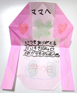 今日の午後、娘(小学校3年生)は、午前中に一緒にゲームをしていたTくんの家に遊びにいった。帰ってきた娘は作ったものを披露し始める...と思ったら、私へのプレゼントだった!可愛い♪開くとこんな感じ。ハートとクローバーの絵と、母の日のメッセージが書いてある。ちなみに、形は自分で考えて作ったそうだ。ちなみにTくんも母の日用に折り紙を使って作ってたみたい。