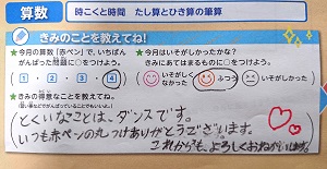 今日、娘(小学校3年生)は赤ペン先生に提出する問題をやった。赤ペン先生の問題用紙には、先生とコミュニケーションをとるために、質問があって軽く答えるコーナーがある。今回は、得意なこと。娘は「とくいなことは、ダンスです。」の後に、「いつも赤ペンの丸つけありがとうございます。これからも、よろしくおねがいします。」って付け足してた。この大人すぎるコメント、どこで覚えた?!ちなみに、国語力が高いのかもしれないけど、この日の赤ペンの漢字は最悪。5問中1問しか掛けてないし、その1問も間違ってる...