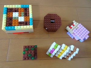 今日は娘(小学校3年生)とレゴで遊んだ。作るテーマは初め「パソコン」って言ったんだけど、すぐに「食べ物」に変更になった。私が作ったのは、味噌汁(裏返すとコーンスープ)・ドーナツ・クレープたこ焼き・サンドイッチ(ハムレタス・たまご・カツ)娘が作ったのは、ケーキ寿司(わさび・まぐろ・サーモン・えび・ネギトロ巻き)マカロン(7種類)プリン・クッキー・飴・地球グミハンバーガー・ブロッコリー・にんじん・チョコパン今日はこれを使っておうちごっこをした。それぞれ自分の家で食べた。それから、娘の家でやっている店でた食べ物やデザート、飲み物を注文して食べて、ほぼお店やさんごっこになった。