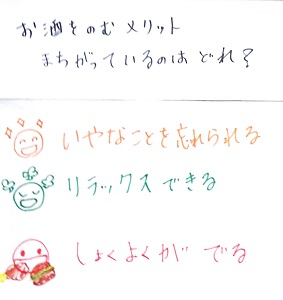 パパの誕生日ニュース用に、パパに関係ありそうなニュースを集めたんだけど、数が少なかったからお酒に関するクイズも追加。お酒クイズが結構多かったから、予定が変わってお酒のクイズになった。<1>お酒を飲むメリットで間違っているものは?1.嫌なことを忘れることができる ★正解★2.リラックス効果がある3.胃液の分泌がさかんになり、食欲が増す補足お酒は脳内ドーパミンの分泌を活性化させる働きを持っているため、嫌なことを忘れるためにお酒を飲むと、逆にその嫌なことを明確に記憶してしまう。<2>昭和15年にビール瓶のビールの量が統一されたのですが、なぜ、ビールの大瓶が633ミリリットルになったのでしょう?1.各社のビール瓶の大きさを調べて、一番小さいものに合わせた ★正解★2.各社のビール瓶の大きさを調べて、平均の量に合わせた3.天皇御用達のビール瓶の量に合わせた補足:ビールの内容量を最小のものに合わせれば、それより大きな瓶も引き続き使用することができるから<3>アメリカのオハイオ州では、あるものを酔っ払わせてはいけません。一体何でしょう?1.子猫2.魚 ★正解★3.蛇補足:理由は不明らしい<4>ドイツは何歳からビールが飲める?1.14歳 ★正解★2.16歳3.18歳補足14歳~:保護者同伴なら低アルコール飲料(ビールやワインなど)はOK16歳~:同伴なしで低アルコール飲料ならOK18歳~:全種類の飲酒がOK<5>中世ドイツで、戦に勝利した騎士達が、ビールで祝杯挙げようとしたところ、ジョッキがありませんでした。しかしビール大国のドイツ人はビールが飲みたいため、あるものをジョッキ代わりにしました。さて、何をジョッキ代わりにしたのでしょう?1.剣の鞘2.兜3.長靴 ★正解★<6>お酒を飲む店「bar」の由来は?1.入り口のドアが棒を組み合わせた簡素な造りだったから2.バーテンダーのと客の境にカウンターがあるから3.酒を盗まれないように酒樽を棒で仕切っていたから ★正解★<7>日本初のビアホールの恵比寿ビヤホールで出したおつまみが不評だった理由は?1.安く大量に手に入るじゃがいもをお湯で茹でただけなので味気なかった2.薄く切った「大根」に塩を添えたものだったので、寂しすぎた ★正解★3.海外から入ってきた臭いチーズを出したので、日本人の口に合わなかった補足:ビールの本場ドイツのおつまみが「ラディッシュ」のスライスだったため、それを大根で作ったのが失敗だった<8>ヨーロッパで始まった乾杯でグラスをぶつける理由は諸説あるが、この中で間違っているのはどれでしょう?1.古代ヨーロッパでは、死者を蘇らせる儀式として、音を鳴らして場所を知らせるために乾杯を始めた。 ★正解★2.中世のヨーロッパでは、お酒の席での暗殺が多かったので、毒が入ってるかを確認するために乾杯するようになった。3.中世のヨーロッパでは、人を狂わせるお酒には悪魔が宿っていると考えられていたため、グラスを合わせて音を立てることで、悪魔を追い払った。補足:グラスを合わせた時にお互いの飛び散ったお酒が入るので、毒が入っていないのを確認できる。<9>日本の乾杯は、日本に来たスコットランドの伯爵をもてなす時に、伯爵が「私の国では国王の健康を祝して杯を交わす習慣があるからやろう」と提案したのが始まり。しかし、明治時代の日本では「乾杯」ではなく別の言葉で乾杯をする習慣が定着しました。何と言ったのでしょう?1.献杯2.安泰3.万歳 ★正解★<10>目下から目上の人に対し自分が飲んだ盃を差し出す「献杯」などは、他人が口をつけた盃で酒を飲むという親愛の証です。しかし、口をつけた盃を差し出すのは無礼なので、盃を水で洗う「杯洗」を始めました。とはいえ、受け取る方は「いや、そのままでいい」というのが礼儀となったそうです。さて、このエピソードからできた言葉は何でしょう?1.家族水入らず ★正解★2.間接KISS3.感情を飲み込む
