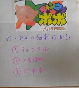 今回のクイズは星のカービィ。本当は息子(中学校3年生)の誕生日用に3月に作りかけたんだけど、他のクイズにしたくなったから、後で使おうととっておいたもの。<1>「星のカービィ」は最初「ティンクルポポ」というゲームタイトルでした。さて、その時のカービィの名前は何?1、ティンクル2、くるポン3、ポポポ ★正解★<2>カービィの名前の由来で間違っているものは?1、アメリカに存在した掃除機会社の名前「Kirby」から取った2、任天堂のアメリカ人顧問弁護士の名前「ジョン・カービィ」のから取った3、カービィの生みの親のあだ名 ★正解★<3>カービィの身長は?1、20cm ★正解★2、30cm3、50cm<4>カービィは何と同じ柔らかさ?1、風船2、マシュマロ ★正解★3、つきたてのお餅<5>カービィの色がピンクなのはなぜ?1、女の子の人気が欲しかった2、ポジティブな印象があるから ★正解★3、かわいいキャラクターが作りたかった<6>アメリカの初代「星のカービィ」は、カービィの色がピンクではありませんでした。一体何故でしょう?1、ピンクのイメージが良くなかったので、空の水色に変更した2、ピンクと◯は、当時アメリカで流行っていたキャラクターと似ているので、星の黄色に変更した3、画面が白黒だったためカービィの色を白だと勘違いした ★正解★<7>カービィが座右の銘としている言葉とは?1、明日は明日の風が吹く ★正解★2、人生は冒険3、笑う門には福来たる<8>カービィ公式Twitterが2019年のエイプリルフールで発表したネタとは?1、カービィが三角になる2、カービィが四角になる ★正解★3、カービィがハートになる<9>イギリスのゲーム雑誌「Edge」で、2010年に『毛糸のカービィ』が受賞した賞とは?1、最も多くのコントローラがテレビに投げられた賞2、最も容赦ない暴力賞 ★正解★3、最も多くのバグが報告されたベストバグ賞<10>カービィがフォートナイトとコラボすると言われている理由は?1、フォートナイトの今後登場するかもしれないコンセプトスキンの中にいた2、パーティーロイヤルのムービーにカービィが映ってた ★正解★3、フォートナイトの世界の家にカービィの絵本が置いてあった