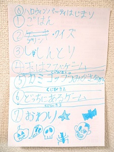 夜はハロウィンパーティーをした。プログラムはこんな感じ。0、ハロウィンパーティーはじまり1、ごはん2、プリン・クイズ3、しゃしんとり4、玉はこびゲーム くじびき5、紙コップつみかさなりゲーム くじびき26、どっちにあるゲーム くじびき37、おわりハロウィンは、ゲームの結果に基づいて、好きなお菓子を取って食べて良いルールだから、ゲームの結果、お菓子が何個もらえるかを考える。お菓子は娘が並べておいた。今回、娘がくじびきを作ったんだけど、せっかくなら、ゲームとゲームの間に挟んでたくさんくじびきをしようということで、できあがったプログラムにくじ引きを追加したから、プログラム上の「くじびき」の文字が小さい。プログラムの書き方は相変わらず適当だけど、下のスペースにハロウィンの絵を描いてた。ということで、パーティーのスタートは夕食から。メニューは、カルボナーラとピザ。ピザは、普段、電子レンジのオーブンで焼くんだけど、今回からは、新しいオーブンレンジで焼けるから、ピザを焼く時間が短縮された。ご飯を食べ終えると、プリン。プリンはコージーコーナーで買ったもの。私と息子がパンプキンで、娘とパパがチョコ。美味しかった!次は、私の作ったクイズ。今回はカービィクイズにした。https://plaza.rakuten.co.jp/imoimoco/diary/202310280001/【クイズ】は10問で、パパが3問正解。娘が5問正解。娘の友だちも5問正解(こっちも娘)息子が7問正解した。お菓子は、正解の数だけもらえる。あと、今回増えたルールとして、サイコロを使って当たりが出ると1個追加でもらえることにした。当たりは、クイズの正解した番号を使って決めた。20面サイコロを振るんだけど、例えばパパは、1問目と8問目と9問目が正解だったから、1,11,8,18,9,19が出ると1個追加でもらえるようになる。次は写真撮影。ハロウィンマンと家族で撮影した。ここからは、主に娘が考えたゲームのコーナー。まず、玉はこびゲームは、おもちゃのまな板にピンポン玉を載せて、落とさないようにスタートからゴールまで歩くもの。途中のセーブポイントもある。で、ルールを説明しようとした時に、娘が「やっぱイマイチだからやめよう」って却下。次は、紙コップつみかさなりゲーム。紙コップを重ねていくゲームなんだけど、いつもは2人で対戦したり2チームに分かれてやったりしてたんだけど、今回は紙コップを1個持ってきて、指定の場所に置いて、また1個取りに行って、戻って重ねる。というゲームに。4人同時にやって競った結果、パパが1番だった。ここで、娘の作ったくじびき登場。くじに書いてあるお菓子を食べて良いというルール。くじは「しょっぱい系」「あまい系」「好きなもの」「はずれ」があって、はずれを引いたらもう1回引けるってルールだ。次は、どっちにあるゲーム。娘が小さい玉を左右どちらかの手に隠して、「どっちに入ってるでしょう?」って言うゲーム。よく、友だちとお菓子を食べるときに、小さいお菓子でやってるらしい。そしてまたくじびき。次に、私が作ったハロウィンカードを渡すんだけど、プログラムに書き忘れてた。カードもカービィが出てくるものだけど、最後のパーティーのページはadoの「唱」https://plaza.rakuten.co.jp/imoimoco/diary/202310280002/ってことで、今年のハロウィンパーティーは終了した。