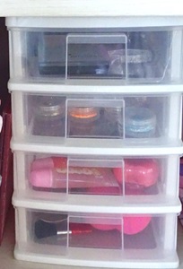 娘(小学校3年生)がTikTokで、メイク道具を引き出しに入れているのを見て、早速、ダイソーで引き出しを買ってきた。メイク道具を片付けて机に置くと、棚にピッタリの高さだった。