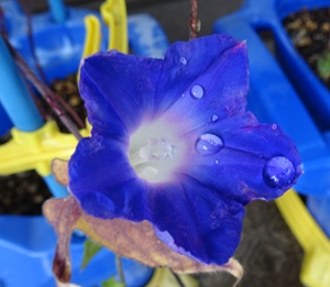 娘(小学校3年生)が1年生の時に育てた朝顔は、2年、3年と収穫したタネを植えて、今年もたくさんの花が咲いたんだけど、咲かなくなってしばらく経って、先週から水をあげるのを止めてた。最近は、突然の夏日がやってきたりと、気温が上がったり下がったりしてるんだけど、今朝、朝顔の花が咲いてた!ということで、今日は水をあげた。