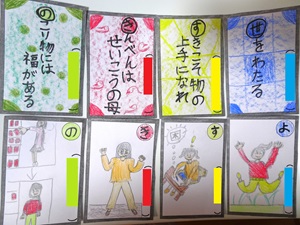 今日、娘(小学校3年生)が授業参観で使ったかるたを持って帰ってきた。ことわざや慣用句のかるたで、娘の持って帰ってきた4枚はこれ。ちなみに、読み札もきれいに模様を描いてるけど、私から見える範囲、みんな白いままだった。たぶん、ササッと作って時間が余ったんだと思う。