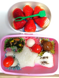 今日は、娘(小学校3年生)の社会科見学に持っていくお弁当を作った。「バスに乗るからスッキリしたものしか食べられないかもしれない」って言うから、入れるおかずは娘に確認して決定した。ちなみに、ご飯は「流れ星」にして欲しいとのこと。ごはんは流れ星にして、ゆかりで味付けほうれん草のソテーは冷凍食品大好きなミートボールは3個うずらの卵3個とミニトマト2個を隙間にデザートはいちご