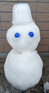 前の賃貸アパートは、広い敷地の中に建ってて余裕があったから、雪が降ると自由にかまくらや雪だるまを作ってたけど、今のマンションでそれは難しい。で、雪が降ったら、娘(小学校3年生)と外に雪を回収しにいって、ベランダに雪だるまを作ってた。今日は午後まで学校があったから雪遊びはしないと思ってたんだけど、娘は帰ってくると雪まだあるから持ってきて雪だるま作ろう」って言うから、一緒に外に出て雪を持ってきた。人が踏まない場所しか残ってないから、取る場所が少なかったんだけど、近所の駐車場の車の前に、車に積もって滑り落ちてきた雪があったから、その雪の上の方を取って持ってきた。雪は水を含んでてシャリシャリだったから、とにかく少しずつくっつけて雪だるまにする感じ。できたのがこれ。目はスーパーボール。帽子はゼリーカップ。明日にはいなくなってるんだろうな。