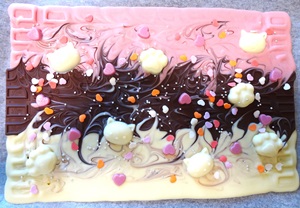 今日は、娘(小学校3年生)とバレンタインチョコを作った。少し前に娘がTikTokで見つけて「可愛いから作りたい!」って言ってたもの。オーブン使うから面倒かと思ったけど、ちょっと使うだけだし、実際に作ってみたら本当に簡単だった。TikTokだと上にのってるチョコがくまだったんだけど、ダイソーに売ってた猫と肉球のものを購入。ホワイトチョコで先に作っておく。板チョコピンク、茶、ホワイトを2枚ずつ並べて、オーブン120度2分(3分って書いてあるレシピもあった)オーブンから出したら竹串(フォークなどでもOK)で色の境目をぐるぐるギザギザすると、良い感じに模様が付く。先に作っておいた猫と肉球と、買ってきたハートチョコ、アラザン、カラースプレーなどを散らして冷えれば出来上がり。包丁をいれると勝手に割れるから、分けてラッピングした。余った部分は家で食べた。当たり前だけど、板チョコだらか美味しい。友だちにはカードを書いて、ハートの後ろに入れた。