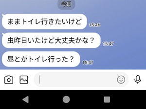 今日、高校の保護者会だったんだけど、家に帰ると、娘(小学校4年生)が「トイレ行きたいんだけど、虫いないかな?」っていう。「いないんじゃないの?」「昨日いたじゃん」「蚊のいなくなるスプレーしたじゃん」「死んだのが床とか壁とかいるかもしれない」「朝全部拭いてるから大丈夫だよ。」それでも見るように言うから、見て「いないよ」って言ったら、やっとトイレに入った。娘は帰ってから5分ほど、私が来るまで待ってたみたい。で、スマホを見たら、娘からLINEが来てた。保護者会が終わって、家に向かってる途中に娘からLINEが来てたみたいで、自転車だったから気づかなかった。で、そのLINEがこれ。そして返事を待っている時に、私が帰ってきたらしい。息子(高校1年生)は何してるのかと思って部屋を見ると、寝てた。いつもはゲーミングチェアで昼寝するのに、今日は布団で寝てた。
