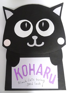 娘(小学校4年生)が猫が好きで、黒が好きだから、ハロウィンだし、今年は黒猫のカードにした。表紙は、結構ネットで検索すると出てくる動物カードの造り。開くとハロウィンの診断テスト。テストの内容はどこからから持ってきた。8月の終わりのことだからよく覚えてないけど、笑うメディアクレージーのような気がする。次はキャットタワーと黒猫。黒猫は外せるから、移動することができる。2段目と3段目なら2匹入れると思う。ちなみにネコは折り紙で作ったんだけど、折り紙だとカードが分厚くなっちゃうから、画用紙で作り直した。せっかくだから、折り紙はハロウィンの飾りといっしょに置いてた。裏は尻尾がぐるぐる回るようになってる。