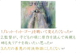 今年のハロウィンクイズは、アナと雪の女王。魔女や魔法使いに関して何かネタは無いかな?って調べてて、映画の興行収入ランキングを見た時、アナ雪が入っていて、息子(高校1年生)も娘(小学校4年生)も、本当にハマった映画だから、これをクイズにしようと思った。<1>エルサはアンデルセンの原作「雪の女王」では悪役なのに、「アナと雪の女王」では悪役にしなかった理由は何でしょう1.主題歌「レット・イット・ゴー」を聴いて製作陣がキャラ変更した。 ★正解★2.監督が、子どもの頃から両親も姉も失うアナを救いたいという思いを持っていた。3.ただの善悪の対決物語にしたくなかったから<2>2013年に公開した「雪の女王」を映画化しようという試みを初めたのはいつでしょう?1.1930年代 ★正解★2.1950年代3.1970年代<3>ハンス、クリストフ、アナ、スヴェンの名前の由来は何?1.ノルウェーの建国に関わった人たちの名前2.原作の作者の名前 ★正解★3.氷の結晶の形の種類の名前※ハンス・クリスチャン・アンデルセン<4>エルサの声を担当したイディナ・メンゼルは、もともとある映画のオーディションに落ちています。どの映画でしょう?1.「メリダとおそろしの森」のメリダ2.「塔の上のラプンツェル」のラプンツェル ★正解★3.「ライオン・キング ディズニーデジタル3D」のシンバの幼馴染のメスライオンのナラ<5>ラプンツェルといえば、とても長い髪の毛ですが、エルサといえば、髪の毛の量がとても多いキャラクターです。エルサの美しいブロンドの髪は、45,000本もの髪の毛で作られていますが、それはラプンツェルの何倍の量なのでしょう?1.5倍2.10倍3.15倍 ★正解★<6>トナカイのスヴェンの動きをリアルに表現するためにしたことは?1.トナカイの研究で有名なロバート・G・ワイトさんに解説と監修をしてもらった2.AIに約250頭の野生のトナカイの動画情報を与えて、分析してもらった3.本物のトナカイがスタジオに連れて来た ★正解★<7>アナと雪の女王の映画内で描かれた雪の結晶は、約2000種類のデザインがあります。何故そうしたのでしょう?1.現実世界でも雪の結晶は一つとして同じ形のものがないと言われているから ★正解★2.エルサの魔法の多様性を表現するため3.制作チームが雪の結晶デザインを競い合った結果<8>アナと雪の女王が公開されて観光客が殺到した場所がありますが、この中で特に観光客が殺到したという情報が無いのはどれでしょう?1.映画の舞台となったノルウェー2.映画『アナと雪の女王』のエルサの城のデザインにインスパイアされたとされているドイツのノイシュヴァンシュタイン城 ★正解★3.映画のモデルになったと噂されているオーストリアのハルシュタット<9>アナ雪でディズニーアニメ史上初と言われていることがあります。この中で間違っているものはどれでしょう?1.ディズニーアニメ史上初のダブル・ヒロイン2.ディズニーのアニメ史上初の女性監督(ジェニファー・リー)3.ディズニー長編アニメ初の興行収入10億ドル突破 ★正解★<10>2019年のアカデミー賞を受賞した「アナと雪の女王」が授賞式に行ったことは?1.オラフの等身大フィギュアが会場に設置された2.「アナと雪の女王2」の世界初予告編が上映された3.9カ国のエルサが集まって「Let It Go」を歌った ★正解