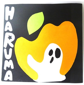 息子(高校1年生)のハロウィンカードは、Mrs.GREEN APPLEにしようと思って、夏からメンバーのイラストを一生懸命描いてたんだけど、いざ、作ろうと思った時に、6日に行った初ライブをモチーフに作ろうと思って、急遽変更。Harmonyのカードになった。表紙はアップルをパンプキンに。パンプキンの下のLラインはアップルのままなんだけど、上のラインは私がパンプキンに変えた。で、葉っぱは同じ。めくると、6日のライブのセトリとメッセージ。作ってみたら、予想外に高級感出て、表紙と全然違う雰囲気に。更にめくると、Harmonyのイラストをハロウィンヴァージョンにして、ちょっとだけアレンジしたものが。HarmonyのロゴをHalloweenに変えたんだけど、普通にペイントでコピペやカット、太さや長さを変えたりするという、PCの中ではかなり原始的な作り方で作った。裏はアップルをママのMにした。