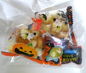 今日の昼は、娘(小学校4年生)が友だちのYちゃんと商店街のハロウィンイベントに行った。私は別の買い物があって出たんだけど、ついでにお祭りで昼食買ってきた。フランクフルトと焼き鳥と唐揚げ棒。それからオリジンで3人分のおにぎりを買うことに。昆布と塩昆布とおぼろ昆布を買った。これなら、パパと息子(高校1年生)に好きなの選ばせても、私は昆布が食べられるw買いものした後に戻ろうと思ったら、娘とYちゃんがマスカット食べてた。娘はほっぺにハロウィンペイント、Yちゃんは、腕にハートとキラキラペイントをしてた。今日のお土産はこれ。お菓子たくさんもらったけど、無料のスタンプラリーの景品のお菓子、大きくてびっくりした。