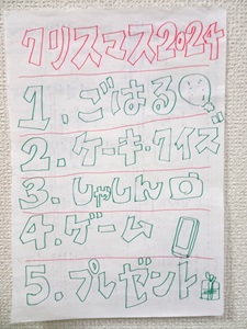 今日はクリスマス会。息子(高校1年生)が英語の宿題で何処かに出かけてそれを説明する文を書く宿題があるから、珍しく一緒に買いに行くことにした。その前に、プログラムを書いたら「ごはん」が「ごはる」になった。娘(小学校4年生)の名前が「こはる」だからw間違えた買い物は、デパ地下チキンを見に行ったら、4軒の店で売ってたから、そのうち1軒を選んで、それぞれ好きなチキンを買った。息子と娘は普通のクリスマスチキンで、私とパパが香草系のチキンにした。ケーキは、まだ時間が早いのに売り切れてる店もあった。息子が普通のケーキが良いって言うから、普通のショートケーキを買うことにしたら、普通にコージーコーナーだけだった。5号は売り切れで、6号を買った。飲み物や他の食べ物は、先に買ってあった。クイズはハロウィン直後に大体作ってあったんだけど、2024年のクイズだから、年末になると作れる問題が多いから、最近情報が出ると、追加や差し替えをしてた。ゲームはどうしようか?って話してたけど、普通にババ抜きとかでも良いんじゃないと思って、そうなった。