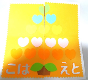 娘(小学校4年生)へのクリスマスカードは、今推し活中のカラピチのえとさん。まずは、えとさんカラーの下地に、カラピチのピーチの色でツリーを作った。反対は、カラピチメンバーを印刷して貼った。あと、ピーチに「Mama」って書いた。BOXの蓋を開けた感じに立体に開くタイプ。右のピーチみたいな資格の中には今年のクリスマスプレゼントの鉄棒とメッセージを書いた。