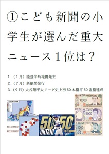 今年流行ったものクイズ<1>こども新聞の小学生が選んだ2024重大ニュース1位は?1.1月能登半島地震 ★正解★2.7月新紙幣発行3.9月大谷翔平大リーグ史上初の50本塁打50盗塁達成<2>パリオリンピックで、日本のSNSで人気があった3人です。この中でも最も話題になったのは誰でしょう?1.無課金おじさん(ユスフ・ディケチ選手・トルコ・射撃) ★正解★2.キャップ拾いのボブ(名前不明・国籍不明・スタッフ)3.編み物王子(トーマス・デーリー選手・イギリス・飛び込み)<3>観光で行きたい都道府県ランキングは、2009年の調査開始以来ずっと茨城県が最下位でしたが、初めて最下位を脱出しました。さて、最下位になったのはどこ?1.佐賀県2.埼玉県 ★正解★3.福島県<4>世界遺産検定を受けた人に聞いた勉強して行きたくなった世界遺産アンケート1位は?1.モン・サン・ミッシェルとその湾 ★正解★2.屋久島3.イエローストーン国立公園<5>10代女子が選ぶ流行ったコトランキング1位は?1.氷タンフル作り2.ギリギリダンス3.焼きポンデ作り ★正解★<6>猫関連で、今年流行ったものランキングに入っているのはどれ?1.猫ミーム、ねこぷりん ★正解★ 2.えびにゃん、ねこぷりん 3.猫ミーム、えびにゃんメタバースプラットフォーム月間アクティブユーザー数ランキング1位は?1.Roblox ★正解★2.ZEPETO3.Fortnite<7>SNS流行語ランキング年間大賞1位は?1.地面師たち2.Bling-Bang-Bang-Born ★正解★3.50‐50<8><9>YouTube国内トップ楽曲ランキング1位は?1.Creepy Nuts「Bling-Bang-Bang-Born」★正解★2.Mrs.GREEN APPLE「ライラック」3.こっちのけんと「はいよころんで」<10>Google鼻歌検索ランキング1位は?1.晩餐歌2.鬼の宴3.Bling-Bang-Bang-Born ★正解★