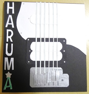今回の息子(高校1年生)へのクリスマスカードは、息子の音楽をテーマに作った。まずは、ギターデザインの表紙。これは息子が部活がない日に、学校に行ってる間、ギターの写真を撮ってきて、見ながら作った。開くと流れ星。これは、息子のバンド名からイメージしたもの。結構芸術品になったと思った。流れ星の真ん中から開けるようになってて、開くと中は部屋。この中にも、息子のもう1個のバンドのバンド名が隠れてる。そして、息子のミニギターも置いた。このギターは、小さいから、ギターの写真をプリントして、画用紙に貼って分厚くしてくっつけた。裏表紙はギターの裏。表紙の表の部分の真裏を作った。