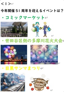 今回は、パパが51歳だから、51という数字に関するクイズ。<1>今年開催51周年を迎えるイベントは?・コミックマーケット ★正解★・世田谷区側の多摩川花火大会・目黒サンマまつり<2>今年川崎市で51周年となるイベントはどれ?・川崎市側の多摩川花火大会・川崎みなと祭り ★正解★・川崎市緑化フェア<3>今年51周年を迎えるコンビニはどこ?・セブンイレブン・ファミリーマート・ローソン ★正解★<4>アメリカの「エリア51」とは何?・宇宙人の研究施設・軍事基地 ★正解★・UFOが落ちたと言われる場所<5>多くの人に愛された国鉄D51形蒸気機関車、デゴイチの説明で間違っているのはどれ?・初期の車両はナメクジ型と言う・アジア進出後、ドイツに進出した ★正解★・日本の動力車の型で一番多く作った<6>「五十一」と書く名前で一番多い読みはどれ?・いついち・いそいち ★正解★・いそかず<7>ペガスス座51番星bとは何?・後からペガスス座の一部として追加された星・太陽系以外で一番初めに発見した惑星 ★正解★・生命がいる可能性があると言われている、唯一目で見ることのできる星<8>2024年世界◯◯ランキング 日本が51位なのは?・幸福度ランキング ★正解★・教育満足度ランキング・報道の自由度ランキング<9>『世界のアソビ大全51』に入ってるゲームの数を51個にした理由は?・開発者が「51」という数字にこだわったため・既に50個プレイできるゲームがあり、それを超えるため・特に意味はなく、ゲーム数が51個だったため ★正解★<10>『世界のアソビ大全51』に入ってるゲームの中で、紀元前4000年くらいに誕生した一番古いゲームは?・セネト・マンカラ ★正解★・バックギャモン