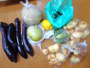 今日、叔母から荷物が届いた。野菜たくさん!パンもたくさん!その前にスーパーの特売で、安くなってる果物買ってきたんだけど、ちょうど安くなくて買わなかったものが箱に入ってて良かった。あと、メロン3種類も入ってた!
