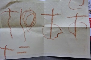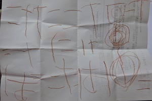 娘(3歳6か月)が、一生懸命、裏紙に字を書いてた。