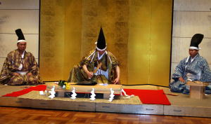 四条流包丁式を見てきました。 ●日本料理の祖神(ツール) 日本料理の故事を調べますと、十二代景行天皇の御代に磐鹿六雁命(いわかむつかりのみこと)の勅命により、初めて大膳職として大御食(おおみやけ)の御膳部を創立しました。やがて、九世紀の藤原時代に光孝天皇の御代に四条山陰中納言藤原政朝が大膳職を継いだ際、古来の方法と海外の料理法を広く取り入れ、四条流という料理方法を確立しています。同時に、豊漁・豊作を天地に感謝する方法として、真魚箸(まなばし)と包丁刀(ほうちょうとう)をもって、清らかに包丁さばきする形式を定めていますが、これが四条流包丁式の始まりです。そのため磐鹿六雁命料理の祖神であり、四条山陰中納言が日本料理の中興の祖となっております。したがって、四条流が日本料理の本流であり、その後、大草・園部・進士・生間(いかま)等の緒流が分派ししていますが、現在では、東京は主として四条流、関西では生間流が相当の地番を占めているようです。という説明もありました。鯉を切り分けるのに手で触れないで、すべて箸と包丁だけでするのです。切り方は沢山あるそうです。(聞いてきたのに、忘れてます。)映画「武士の一分」でも、ちらっとこの四条流の包丁さばきがでてました。なんでも、つぶ貝をあのように包丁で切ることはないそうですが・・・今回のものではありませんが、ここに動画が見られるところがありました。千倉町商工会ホームページから・・・動画で見る包丁式ちょっと長いですが、時間があったらごらん下さい。