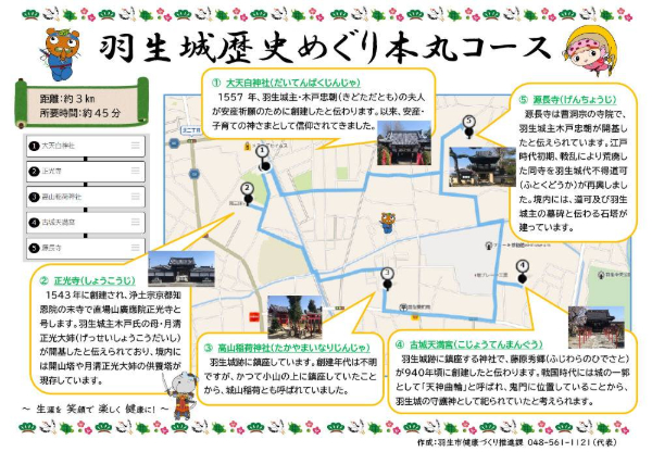 羽生市LINEのお知らせ「羽生市健康ウォーキングコース」の紹介。羽生市健康ウォーキングコース「羽生城歴史めぐり本丸コース」のウォーキングマップを作成しました!羽生城の歴史にまつわるウォーキングコースです。歴史を学びながらウォーキングで健康づくりをしましょう。▼問合せ 健康づくり推進課(内線172)