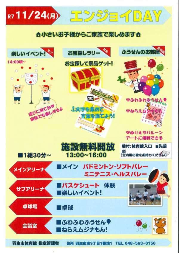 羽生市LINEのお知らせ「エンジョイDAY」の紹介。「エンジョイDAY」開催のお知らせ 羽生市体育館を無料開放します!この機会にスポーツの楽しさを感じながら健康増進を図ってみませんか。お子様向けのイベントも企画しています。お一人はもちろんご家族、お友達とのご参加も大歓迎!ご来館、心よりお待ちしています。▼日時 11月24日(月)13時~16時▼場所 羽生市体育館(館内)▼費用 無料▼問合せ 羽生市体育館(048-563-0150)