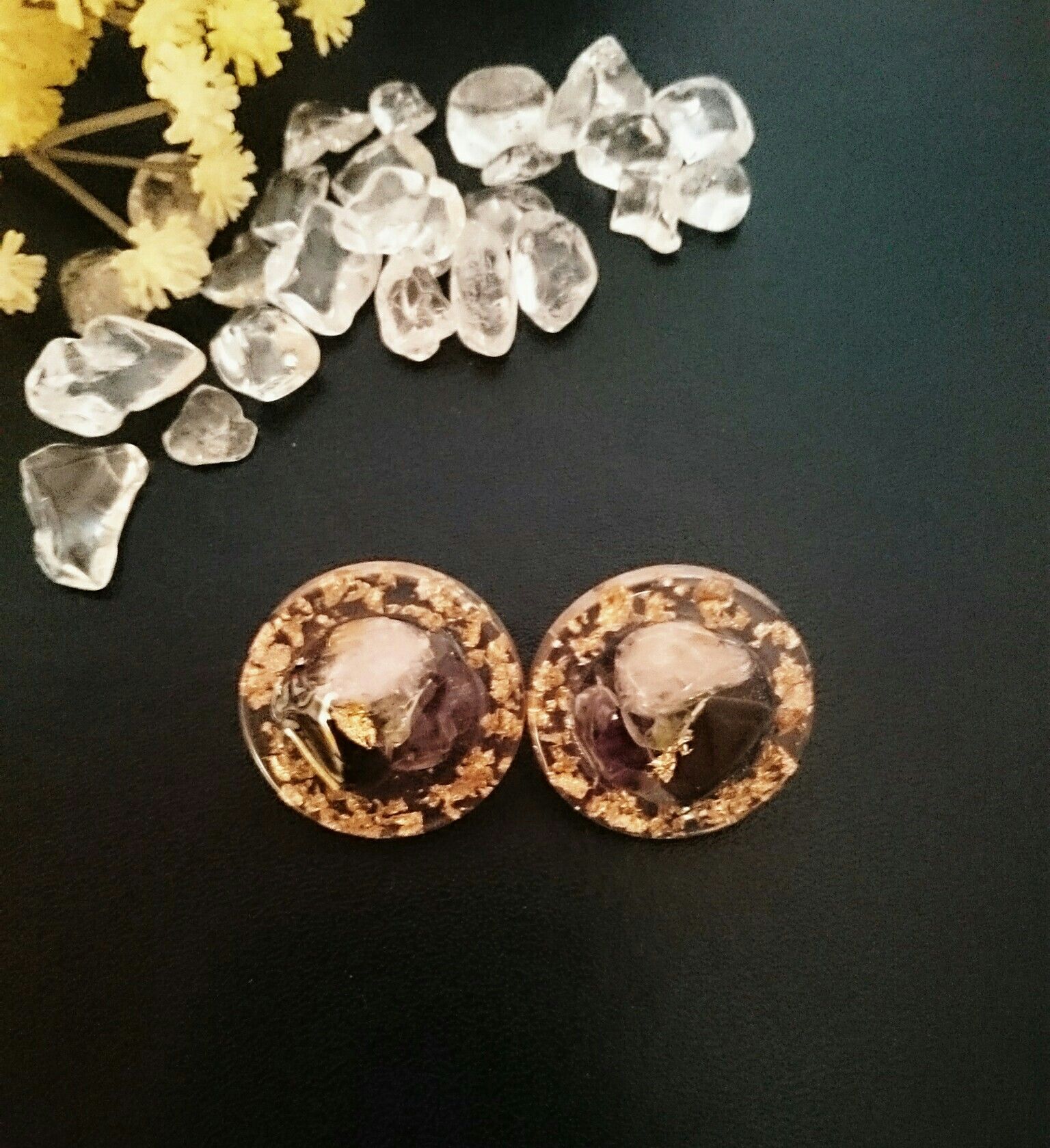 いつもご覧頂きありがとうございます アクリルのラウンドパーツに4種類の天然石を敷き詰めたピアスができました。アメジストとレインボーオブシディアンがシックな雰囲気です。 【ラウンド天然石ピアス】はラクマにてご購入頂けます