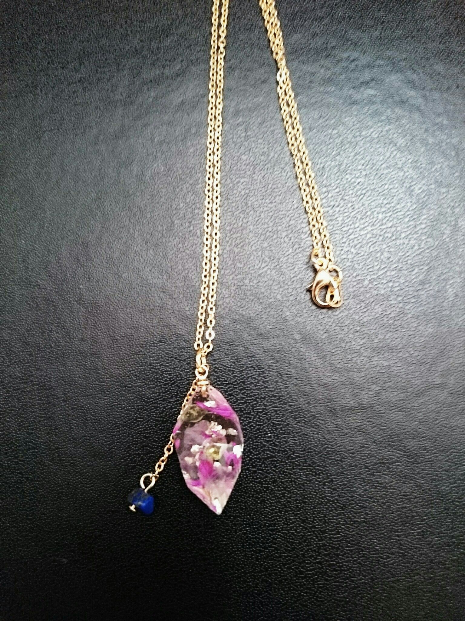 いつもご覧頂きありがとうございます 先日作製した千日紅ドライフラワーとアメジスト・ペリドットのさざれ石の入った鉱石型を使ってネックレスを作りました。鉱石と揺れるラピスラズリが可愛らしいデザインです。 【鉱石型天然石ネックレス】はラクマにてご購入頂けますので、覗いてみてくださいね
