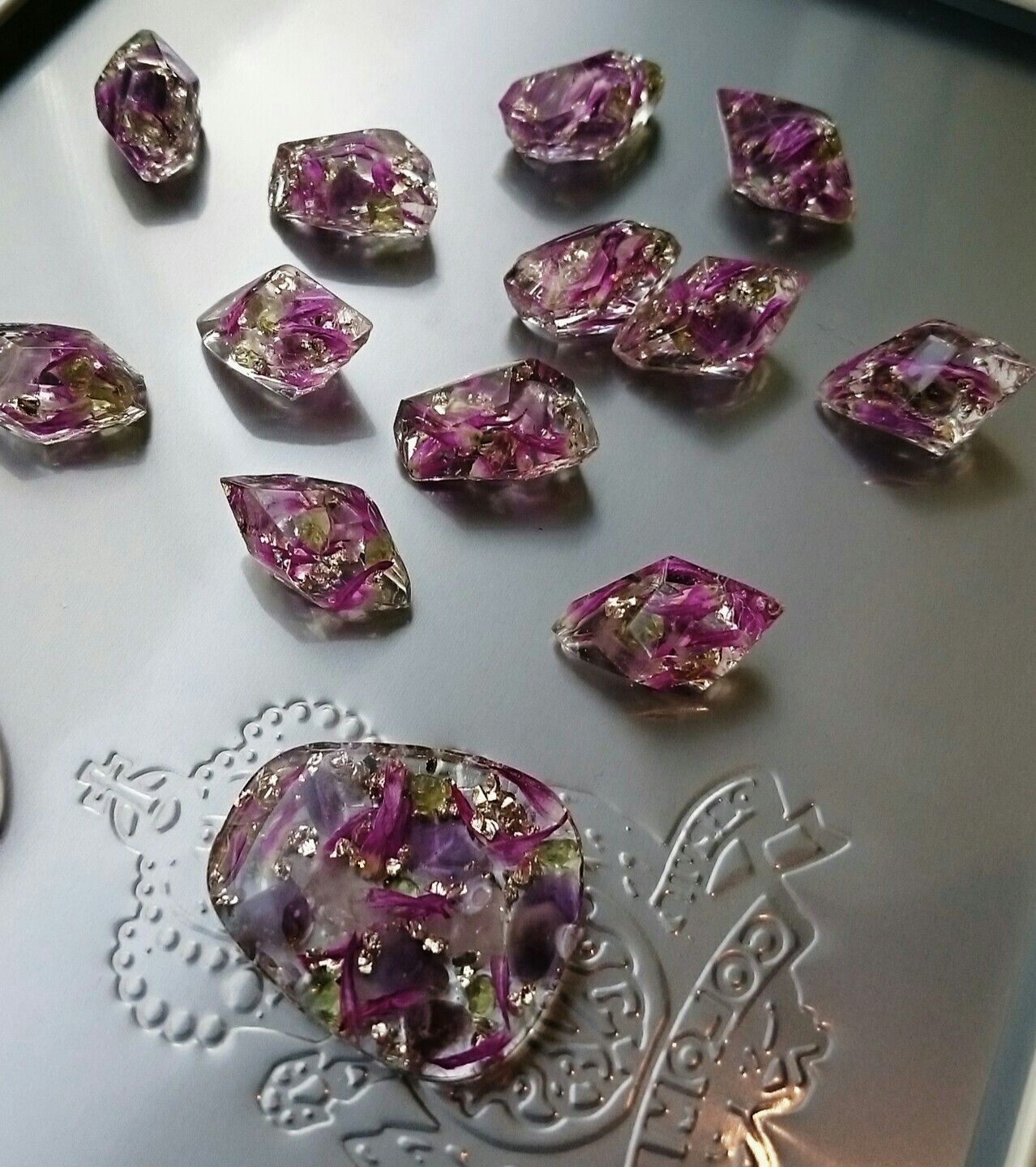 いつもご覧頂きありがとうございます 久々の鉱石型です。ドライフラワー(千日紅)とさざれ石の組み合わせで鉱石型と変形スクエアのモールドで作ってみました。 まだモールドから出しただけで何もしていませんが、可愛らしいアクセサリーが出来そうな予感がします