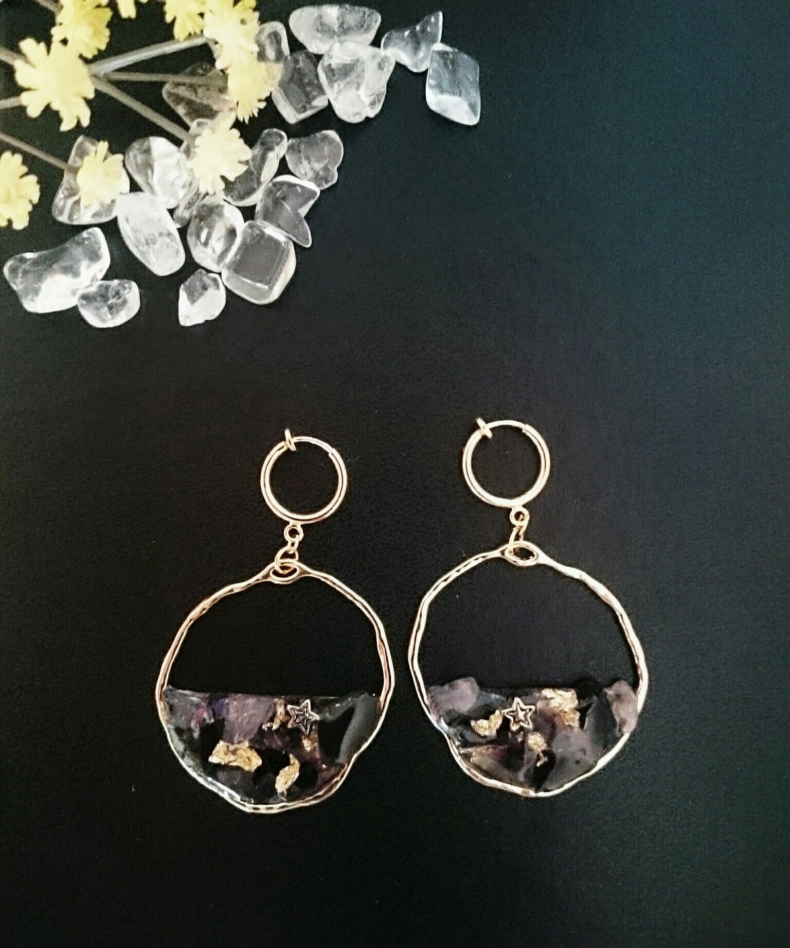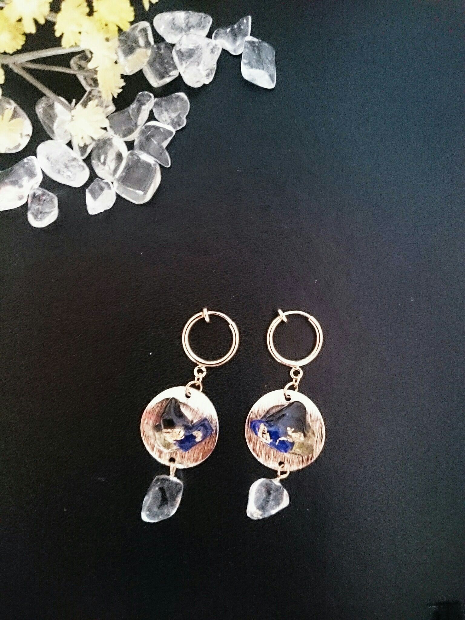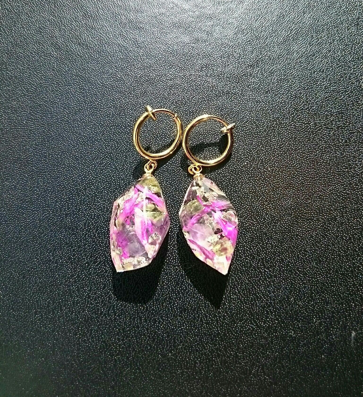 いつもご覧頂きありがとうございます 千日紅ドライフラワーとさざれ石を使った鉱石型のイヤリングとピアスが各1点ずつ仕上がりました。ドライフラワーとさざれ石の組み合わせが素敵です。 【鉱石型フープイヤリング・フックピアス】はラクマにてご購入頂けますので、覗いてみてくださいね