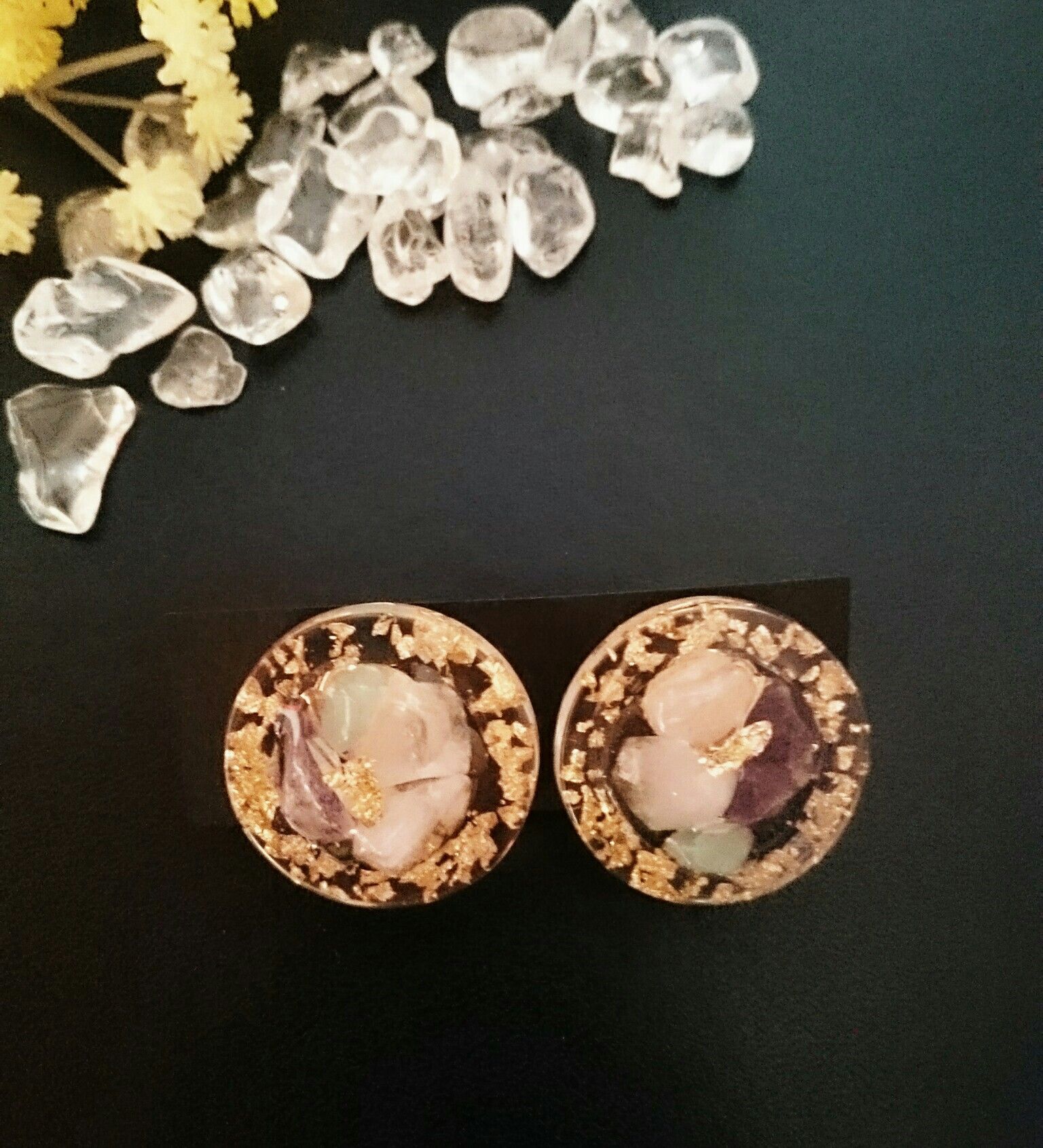 いつもご覧頂きありがとうございます 10月第1号です! アクリルのラウンドパーツに3種類の天然石を敷き詰めた優しい雰囲気のイヤリングができました。 【ラウンド天然石イヤリング】はラクマにてご購入頂けます