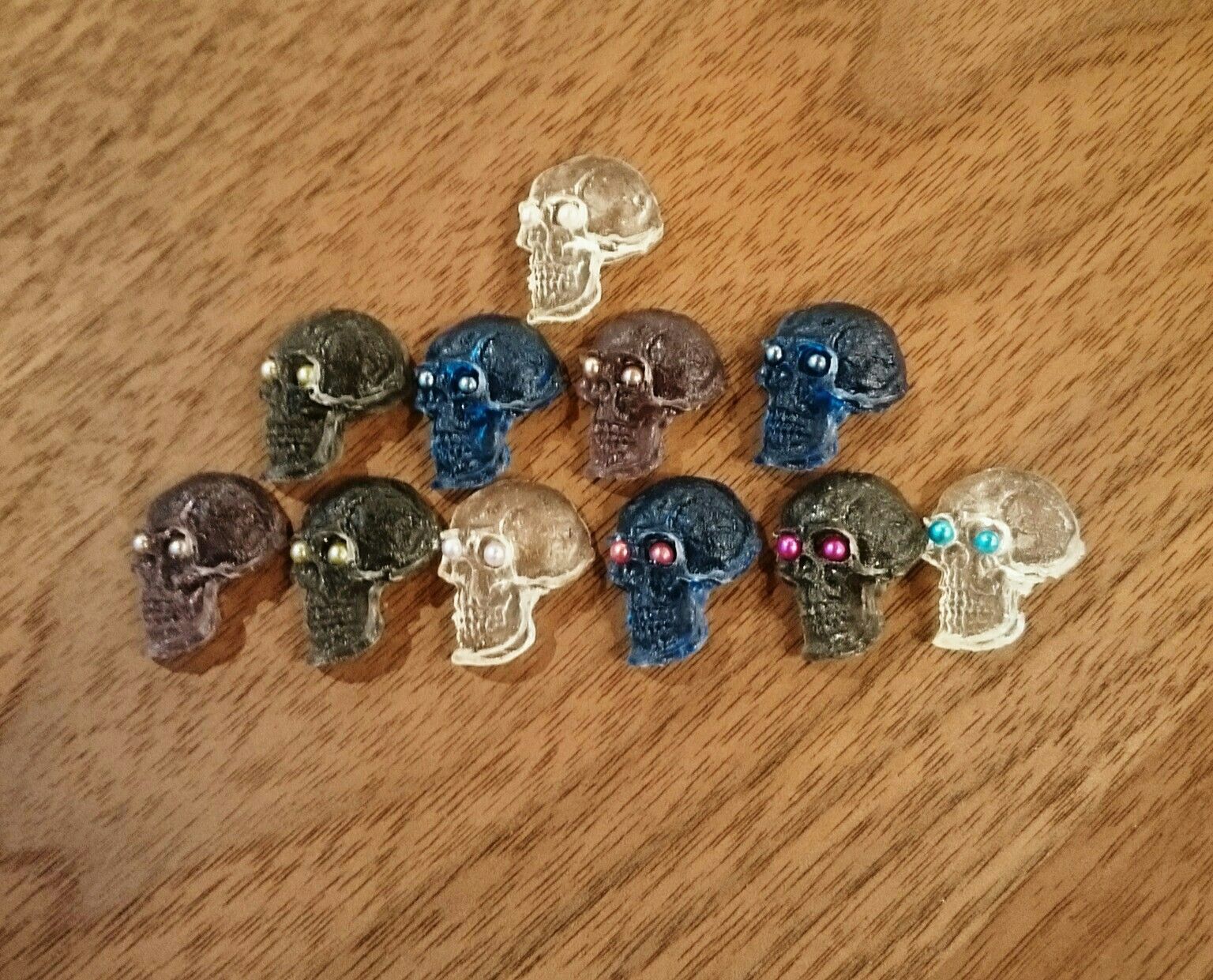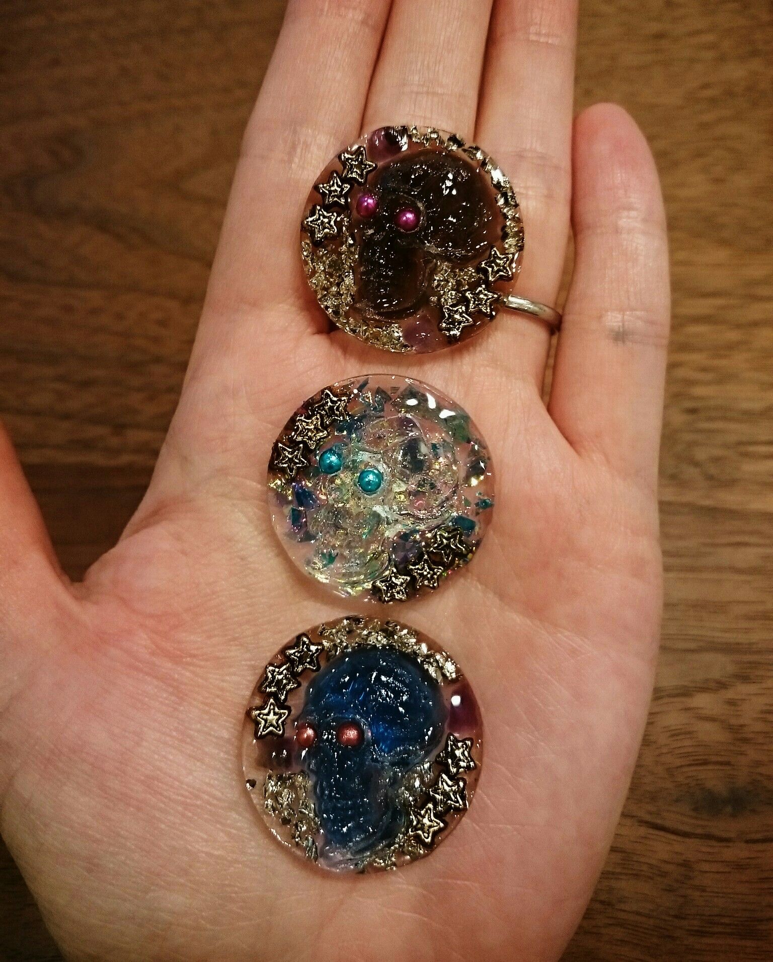 いつもご覧頂きありがとうございます ドクロちゃんの続きです。それぞれ単色のドクロちゃんたちなので、そのまま使うのは寂しいかなと思って、丸のシリコンモールドに入れて封入物をいろいろ入れてみました。これらはヘアアクセサリーにちょうどいどいいかな