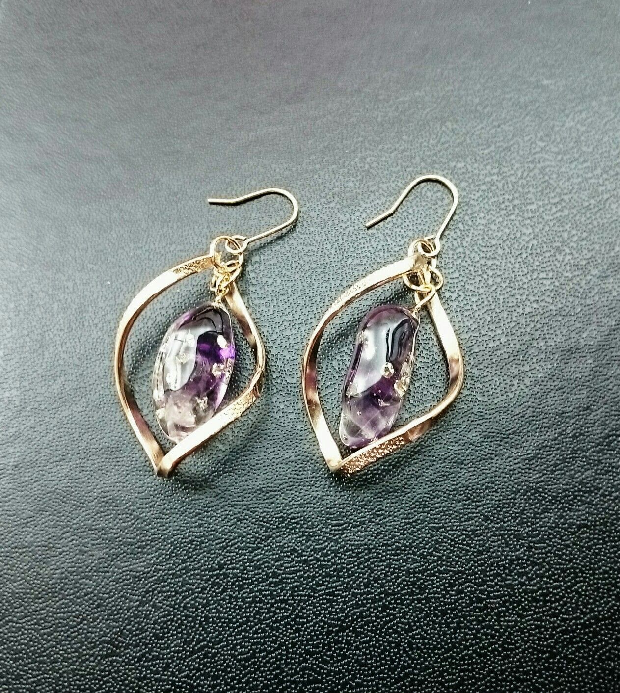 いつもご覧頂きありがとうございます 以前さざれ石を敷き詰めたツイストチャームが思うように出来ず放置しておりましたが、アメジストをレジンとクラッシュストーンでコーティングして一緒に揺れるデザインで作ってみました。艶々していてきれいです。 【アメジストフックピアス】はラクマにてご購入いただけますので、気になる方は是非