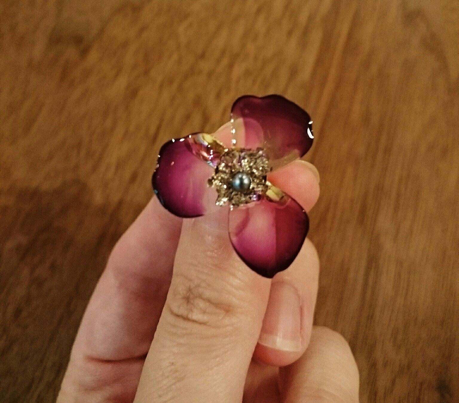いつもご覧頂きありがとうございます。 今日は途中で中断していたお花にイヤリングやピアス等のパーツを付けました。接着剤で付けて1日置いて、後日裏側のコーティングをします。 写真は秋らしいルビーレッドのお花のリングです。今週中には出来上がるかな~